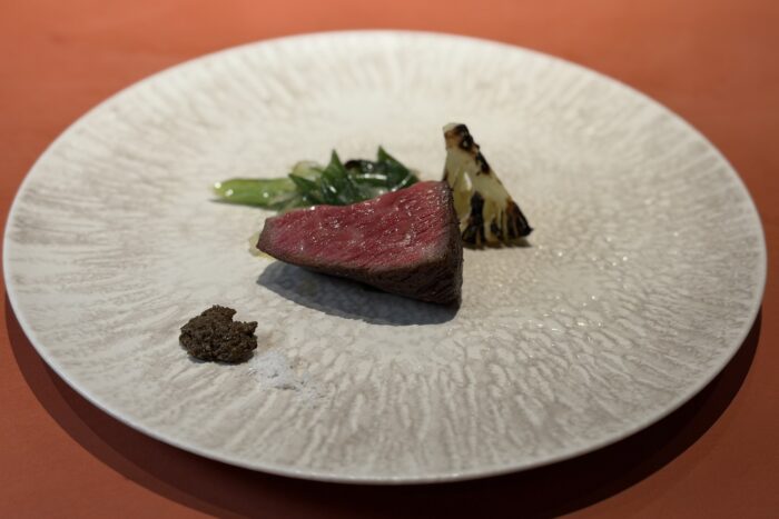 じっくりと炭火で火入れした黒毛和牛のステーキ。岩手県産黒毛和牛の希少部位トンビを使用していて、赤身ならではの肉の旨みをしっかりと感じられます。