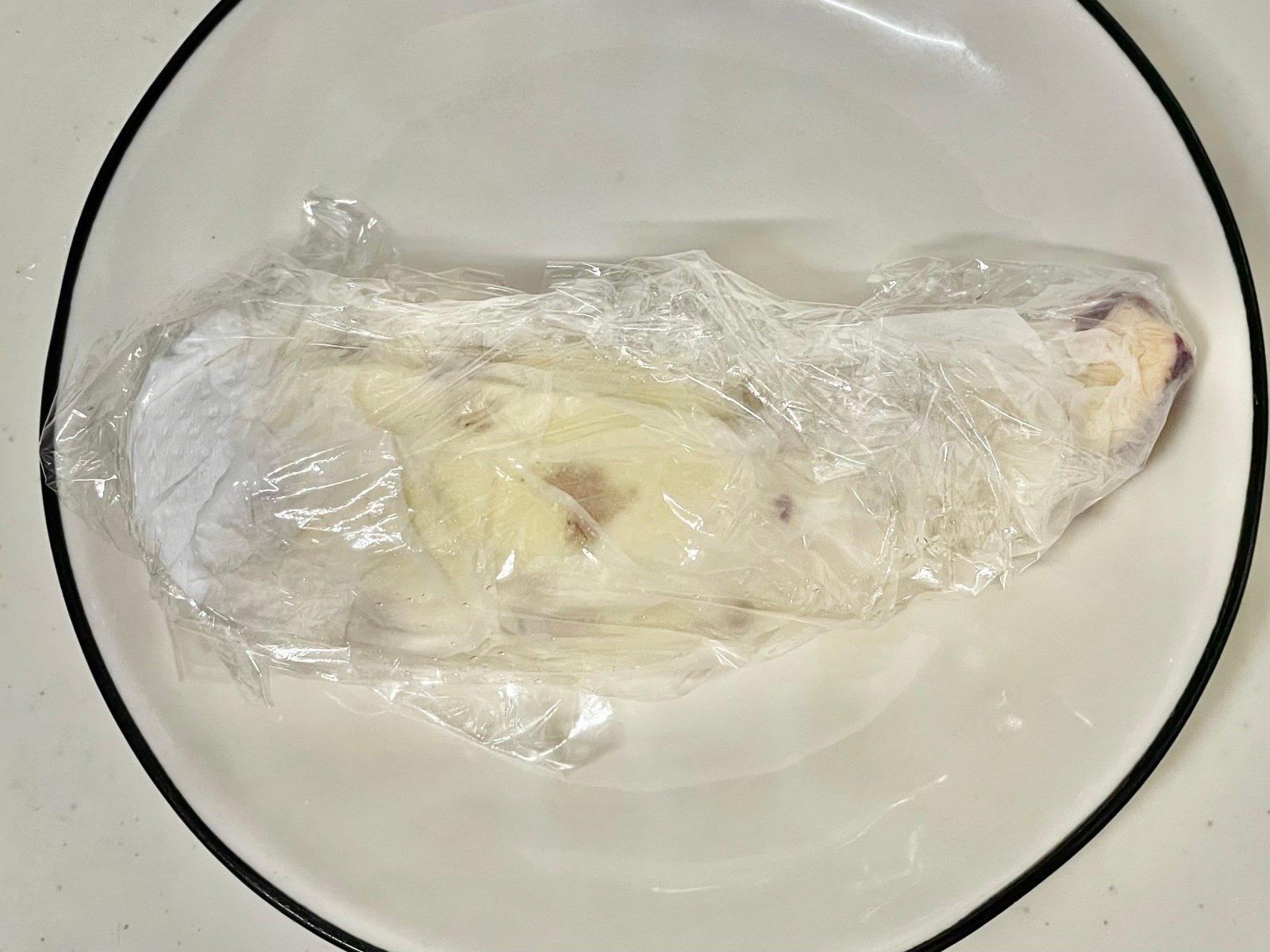さつまいもの皮を剥いたら濡れたキッチンペーパーで包んでからラップで包みます。