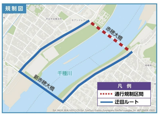 橋の修繕工事に伴い、赤穂大橋の通行規制が12月1日(月)午前9時から行われる。規制期間中は約500メートル南の新赤穂大橋へ迂回するよう誘導する。