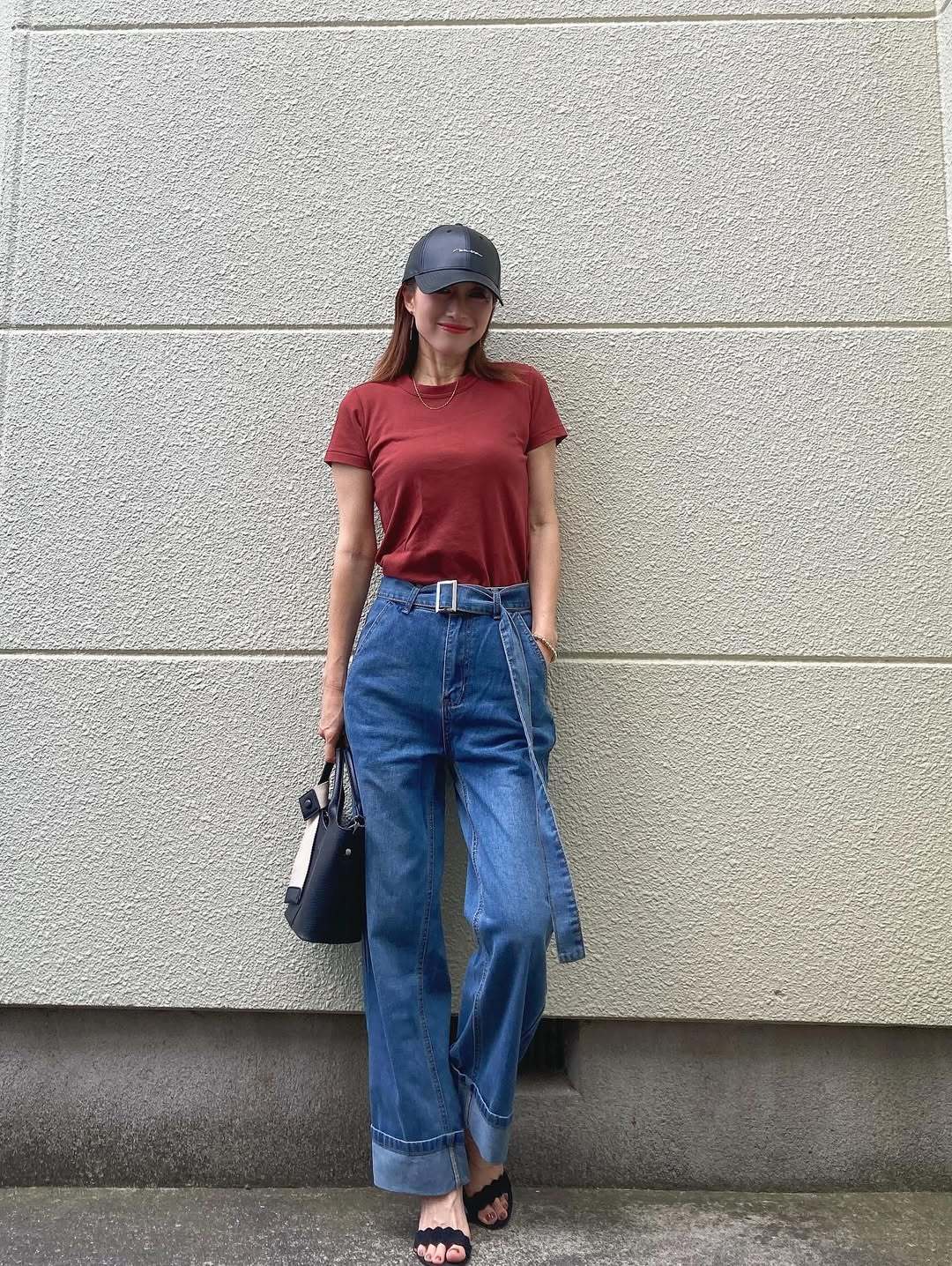 オーバーサイズすぎない赤Tシャツを選び、ウエストインするだけでほどよいきちんと感が出せます。