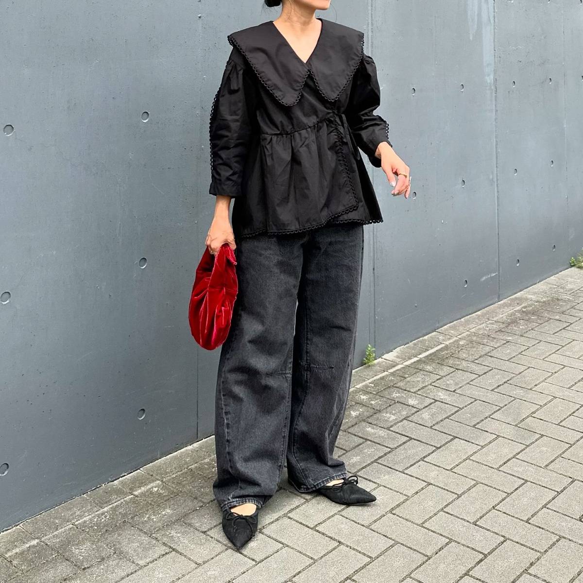 【11月編】老け見えしないデニムパンツコーデ②大きめフリルのブラウスを合わせる♪