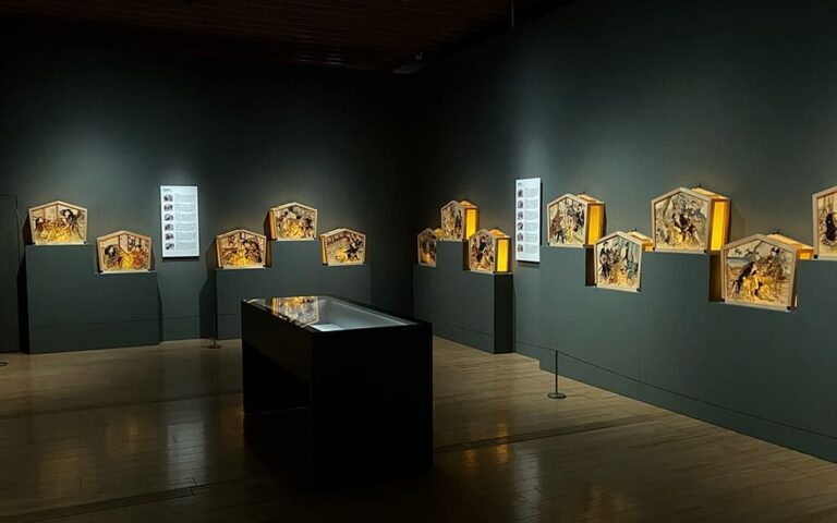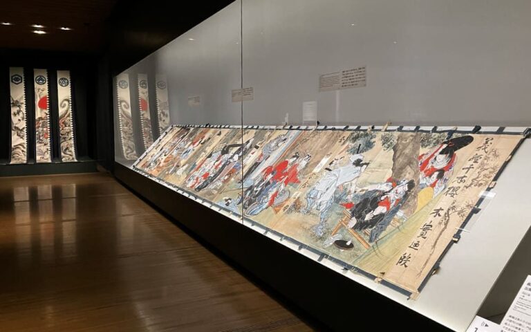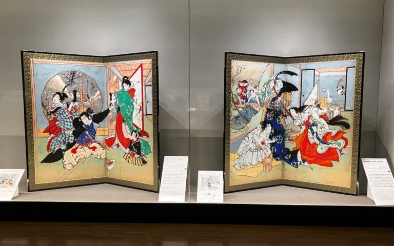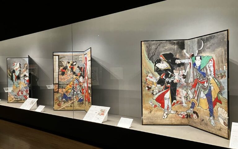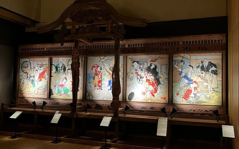 また、展示されている芝居絵屏風には、物語の背景や登場人物の関係がわかる丁寧な解説パネルが添えられており、登場人物の名前や台詞、場面の構図などが図解付きで紹介されています。