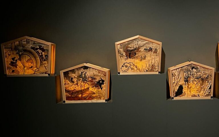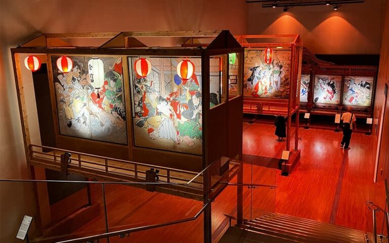 高知市朝倉の朝倉神社で夏祭りに組まれる、山門型の絵馬台も再現されています。屏風絵が高所に掲げられ、見上げる視線とともに絵の迫力が増す構造は、まさに“見世物”としての芝居絵の本質を感じさせてくれます。