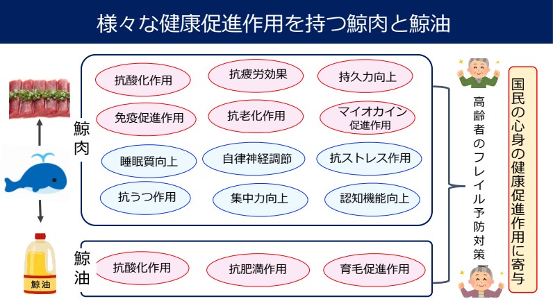 「クジラは、ほとんど捨てる部分がなく幅広く活用できる食材です。私たちが『マリンビタミン』と呼んでいるのは、クジラ肉に限らず海の生物に含まれる栄養素の総称です。食の多様性が広がり、それぞれが好みや体調に合わせて食を選べる時代だからこそ、海の恵みが持つ栄養素にも注目していただければと思います。フレイル予防の一つの選択肢として、クジラ肉を取り入れる可能性があるのではないでしょうか」