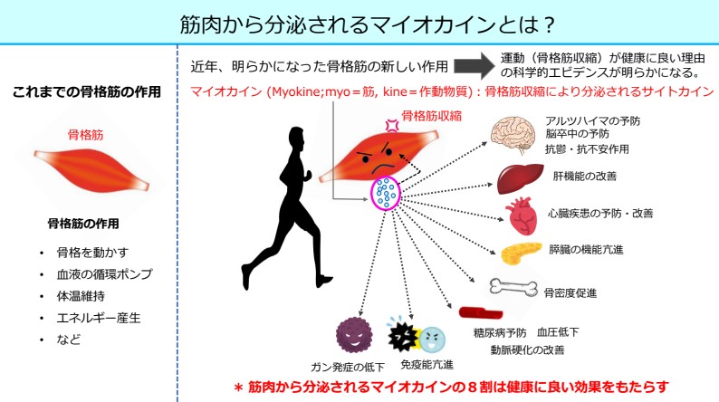 さらに塩田教授は、筋肉から分泌されるホルモン「マイオカイン」との関係にも言及。マイオカインは糖尿病や心疾患、骨粗しょう症、認知症などの予防に効果がある“万能ホルモン”とも呼ばれる物質だ。研究の結果、運動とともにバレニンを摂取することで、このマイオカインの分泌が飛躍的に高まることがわかった。