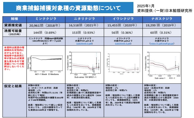 捕獲は「改定管理方式(RMP)」という国際的なルールに基づき、持続可能な範囲で頭数を定めている。2025年時点で、ミンククジラ144頭、ニタリクジラ153頭、イワシクジラ56頭、ナガスクジラ60頭などが上限であり、こうした捕鯨のルールを守って捕獲していけば、今後100年先も資源として利用可能とされている。