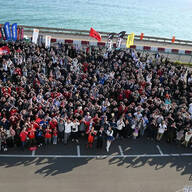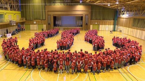 「人文字で地図記号をあらわした人数は…654人で、見事世界記録達成です」