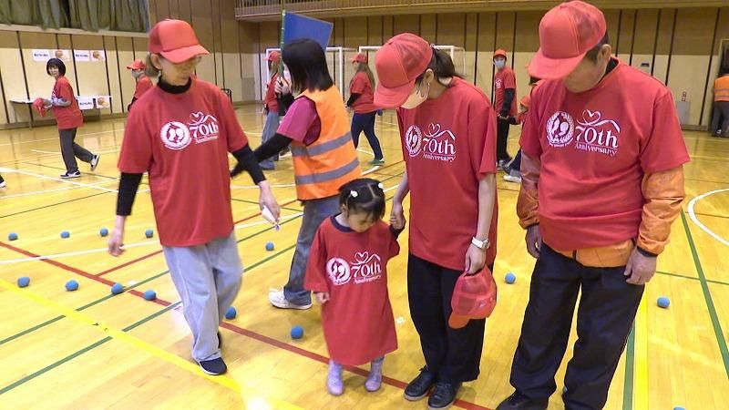 ちびっこも赤い帽子とTシャツで大集合!北海道の温泉のマチのマークで狙うは世界記録