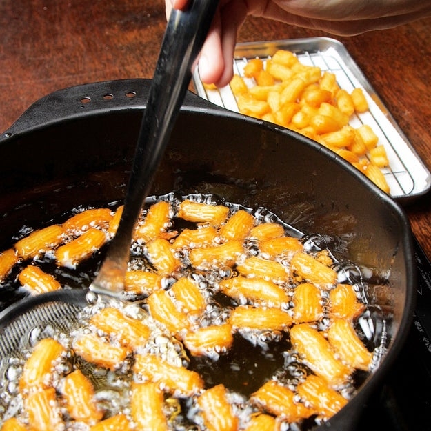 ④ 揚げ物用の鍋に揚げ油を入れて170℃に熱し、③を絞り、2cmずつハサミで切る。