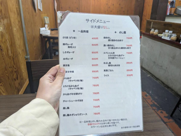 メニューは40種類ほどあり「醤油・塩・豚骨」などのラーメンをはじめ、「餃子」や「焼きめし」などのサイドメニューも充実しているので、どれを注文しようか悩んでしまいます。