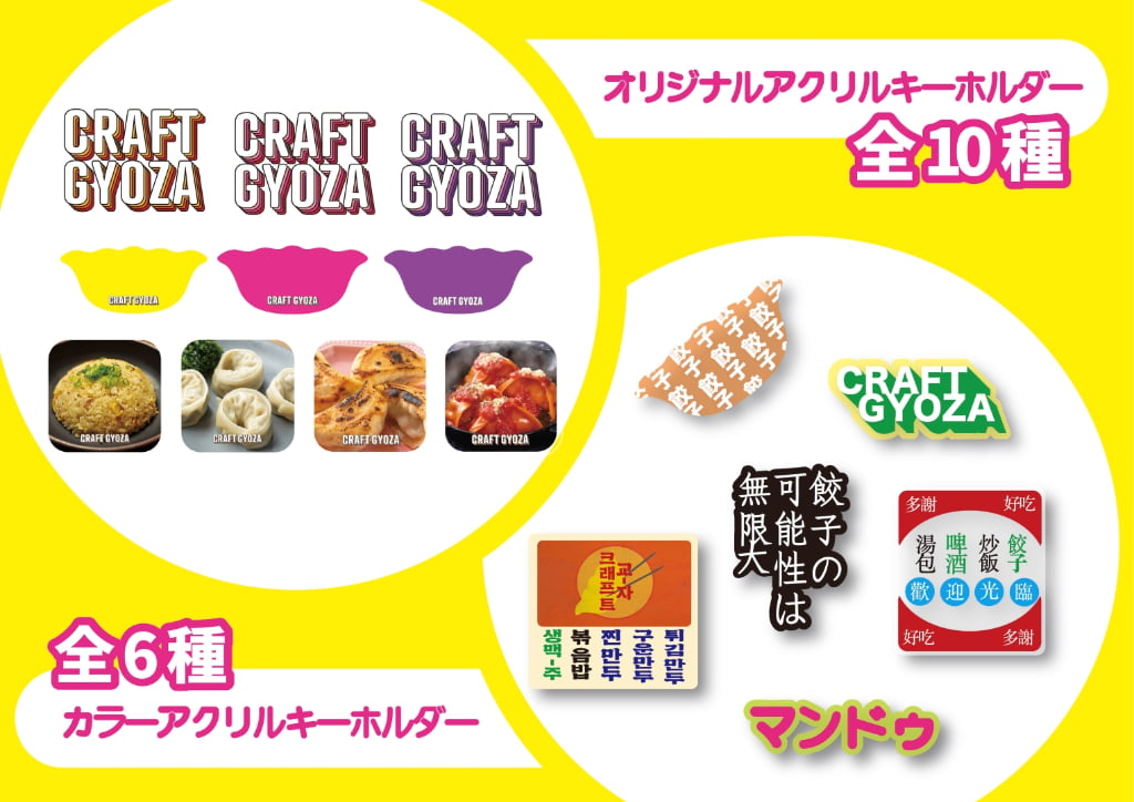“餃子愛”を形にしたカプセルトイコーナーも見逃せません。アクリルキーホルダーは、ラメやロゴ、料理名をさまざまな言語でプリントした遊び心あふれるデザインに。思わず何度も回したくなるかわいさです♡