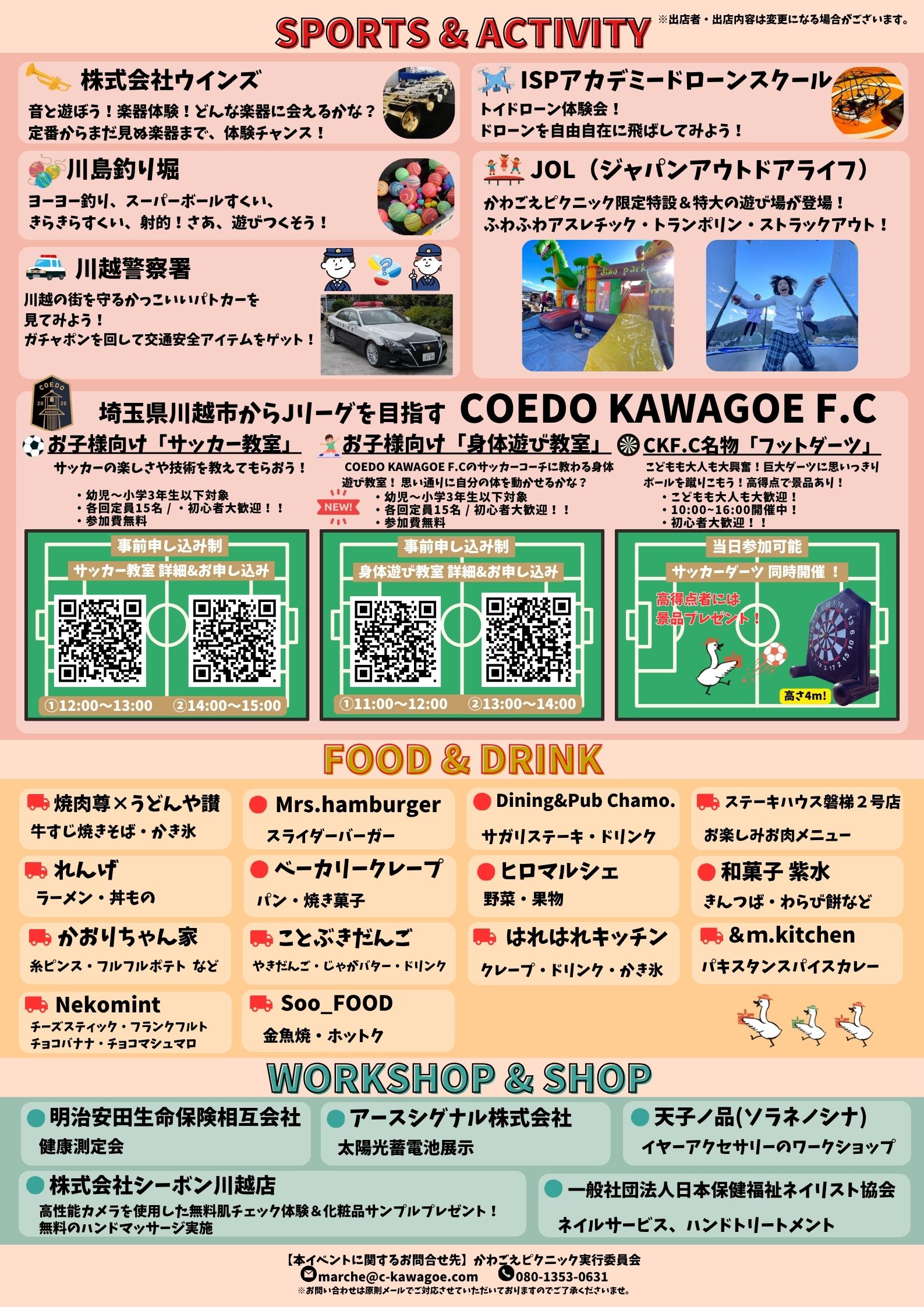 そのほか、事前予約制となりますが、小学生低学年向けに川越からJリーグを目指すCOEDO KAWAGOE F.Cの小学生の子ども向け無料サッカー教室も同時開催されます。
