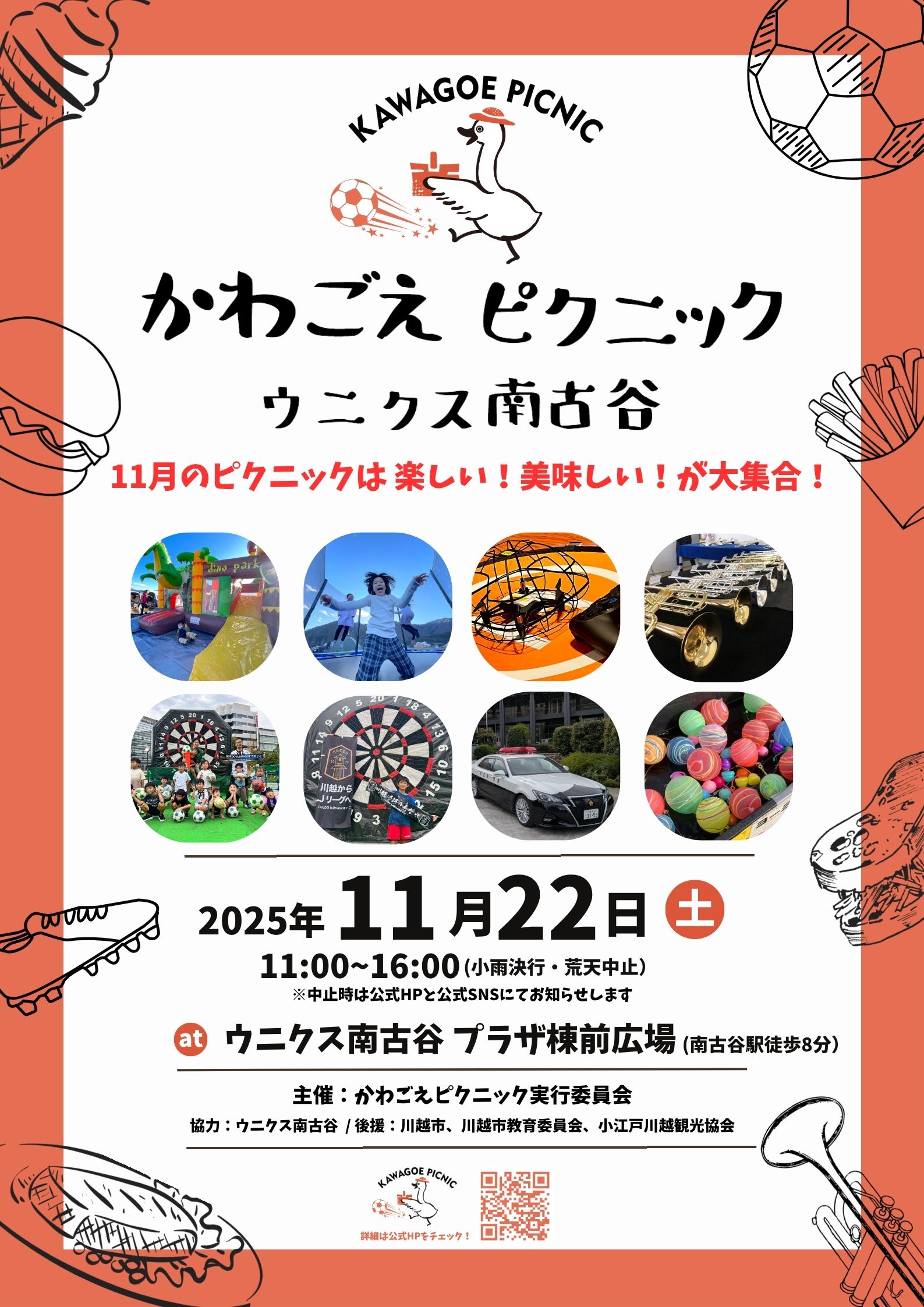 「かわごえピクニック@ウニクス南古谷」11月22日(土)@11〜16時に人気の飲食店やワークショップを中心に約30店舗が出店!無料サッカー教室やフワフワ遊具、トランポリンなどスポーツイベントも