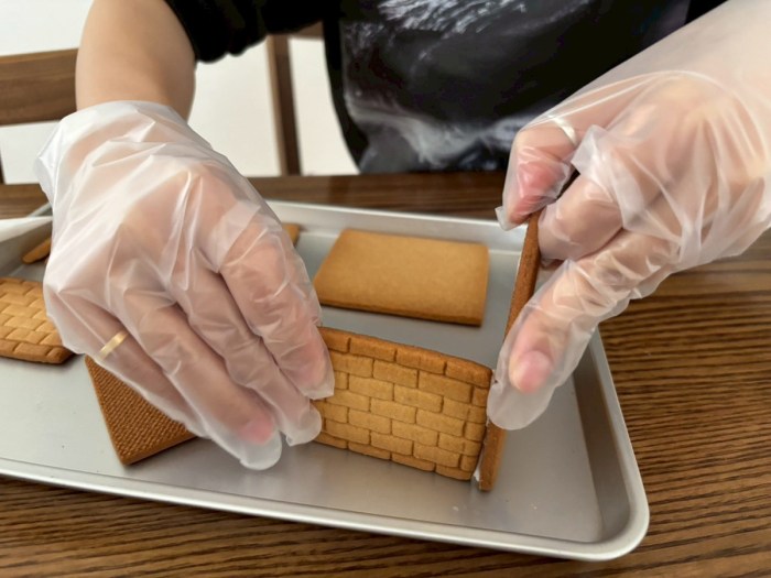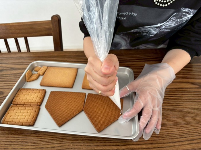 早速アイシングを絞ってパーツを固定していく。パーツを見ながら、建築士の友人が「これは切妻屋根だね」とボソリ。そんな名称があったのか!