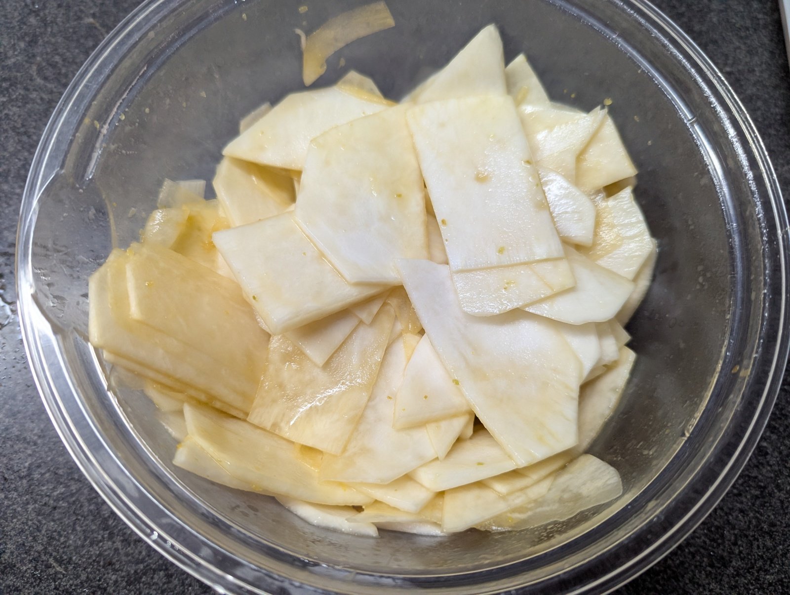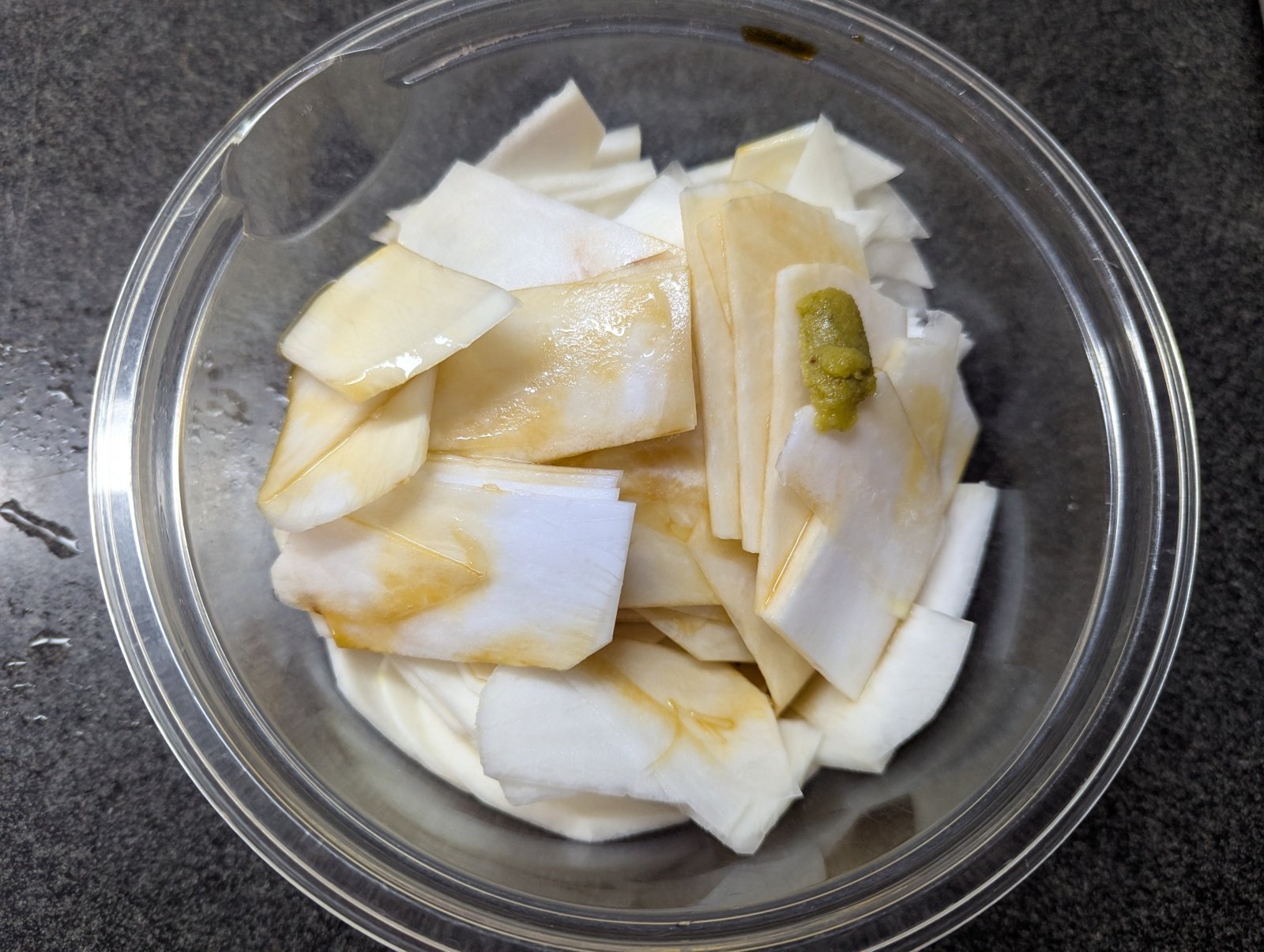 3. ボウルにカブ、オリーブオイル、醤油、レモン汁、柚子胡椒を加えて混ぜ合わせます。