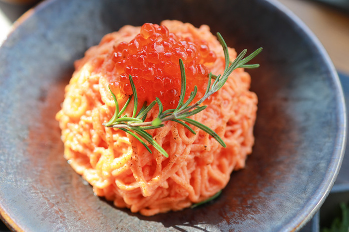お魚屋さんとしての経験を持つ店主が目利きしたサーモンをムース状に仕立てたインパクト抜群のビジュアルは、一度見ると忘れられません。