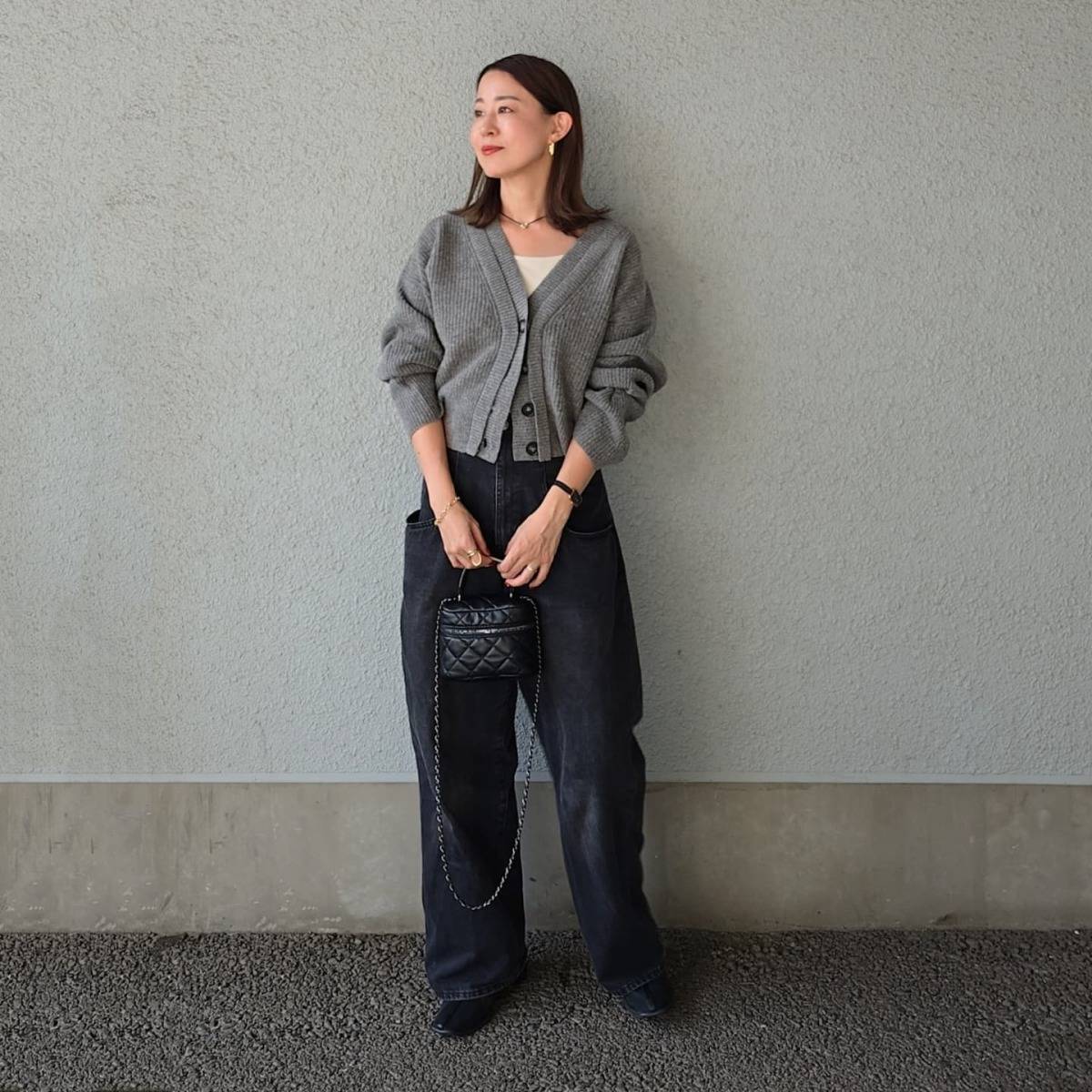 【11月編】センスいいパンツコーデ③グレーカーディガン×黒パンツの濃色コーデ