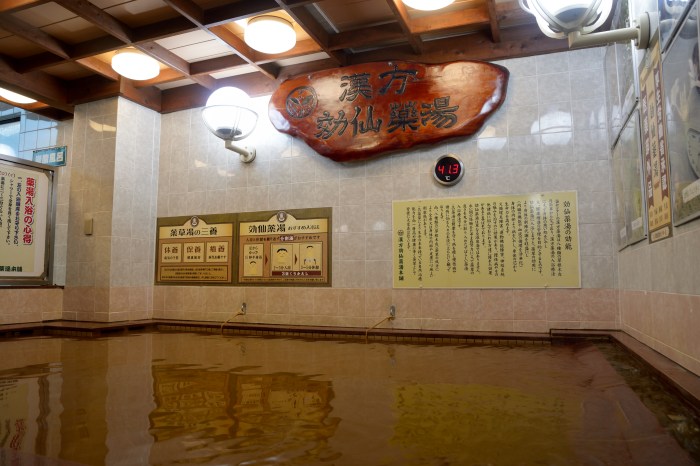 一番有名なのが35年の歴史を誇る「効仙薬湯」、通称チンピリである。まるで漢方薬の中に浸かっているような強烈に温まる黄金色の薬湯で、人の生命の源である珍や満といったデリケートゾーンがピリッとするので「チンピリ」と愛好家たちから呼ばれている。