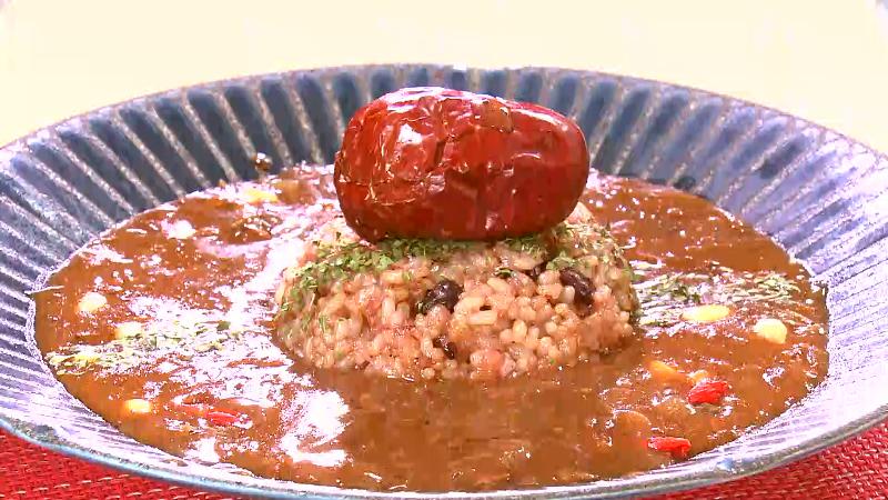 気になっていた玄米ご飯の上に乗った大きな赤い実の正体は、大ナツメでした。