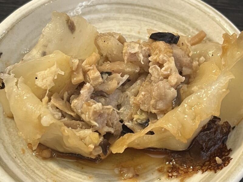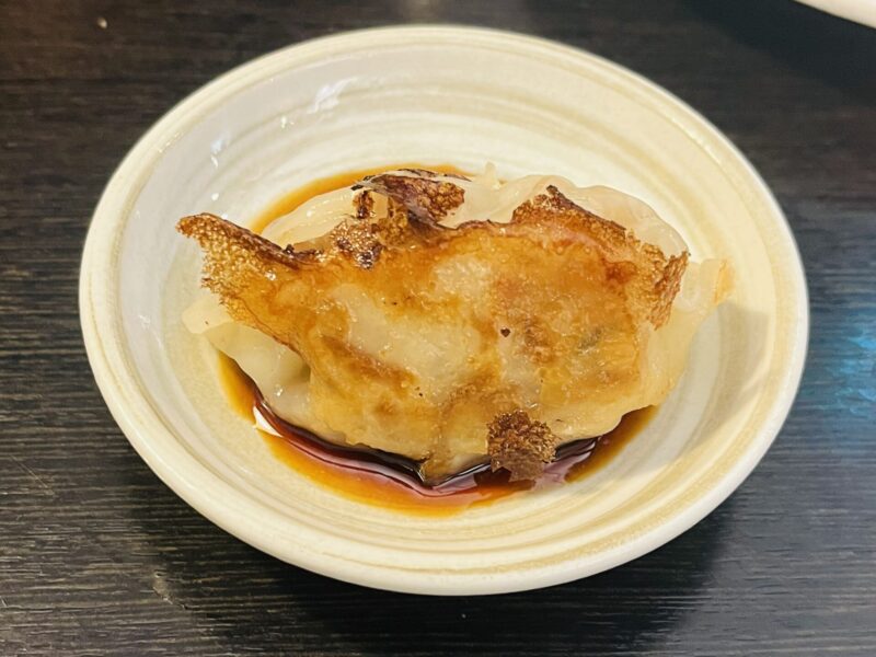 スタッフさんに教えてもらいました。中身は「チャーシュー、キクラゲ、めんま、揚げた麺」。なんと!ラーメンに入ってるオールスターが集合する餃子でした。まさに「ラーメン屋ならではの具」、小洒落た演出に感動。