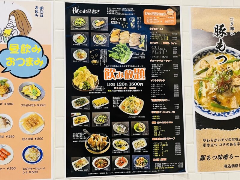 山頭火北1条チカホ店では17時から夜メニューを提供しています。なんと飲み放題まであるんです。「120分 1,500円」しかもラストオーダー10分前ですと!? 太っ腹な飲み放題でございます。