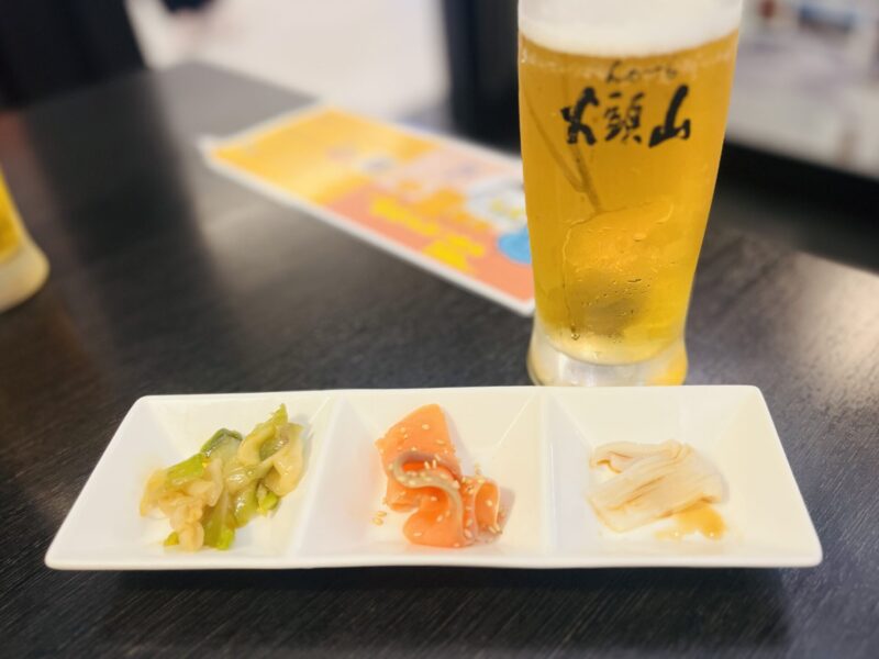 生ビールはアサヒスーパードライ、グラスもビールも冷えてます。おつまみはザーサイ、スモークサーモン、イカ刺しがひと口ずつ。