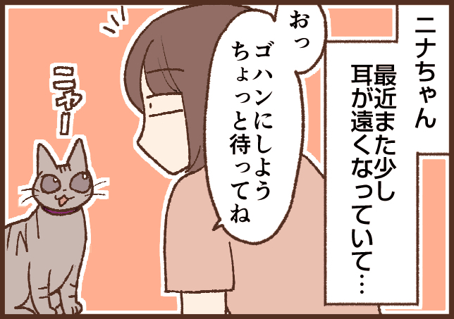 5匹中4匹はシニアなので全員なんとなく耳は遠いのですが、ニナちゃんは本当に耳遠くなったな~、と思うことが増えました…。