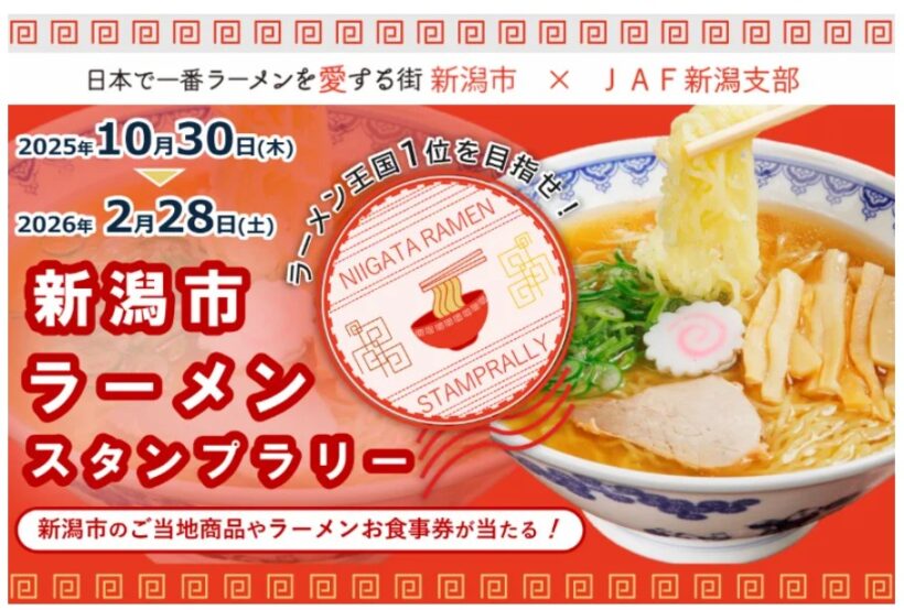一般社団法人日本自動車連盟(JAF)新潟支部(新潟市中央区)は10月30日から2026年2月28日まで、新潟市と共催で「ラーメン王国1位を目指せ! 新潟市ラーメンスタンプラリー」を開催する。新潟市内のラーメンの魅力を発信し、観光振興を図る狙い。