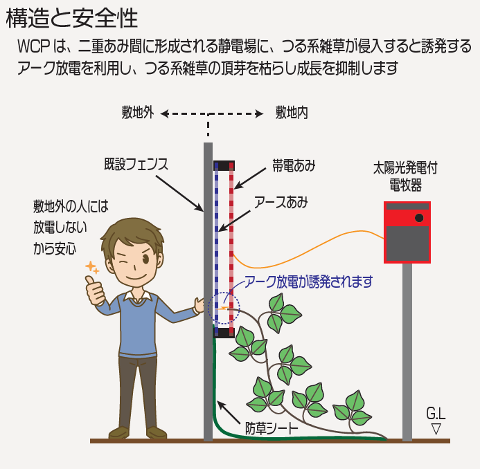 静電気で植物の先端だけを枯らす、という装置。「WCP(Weed Control Panel )」と言います。