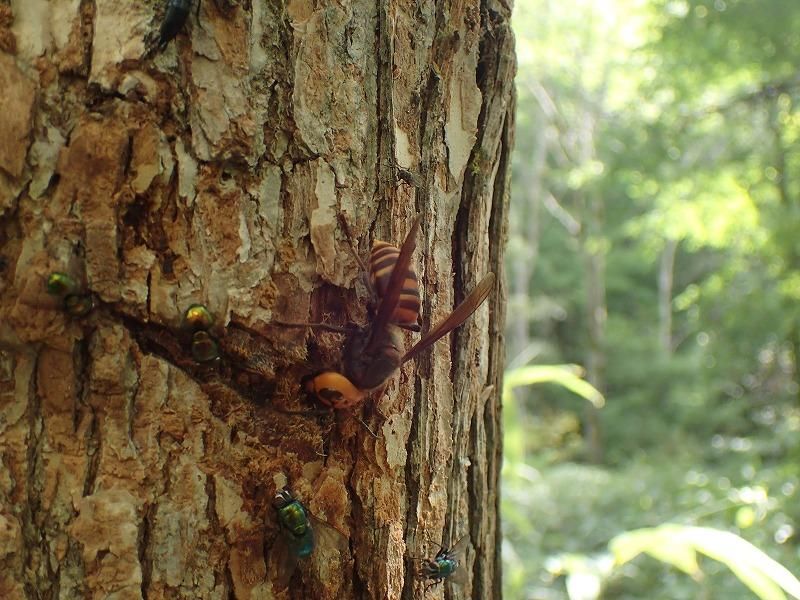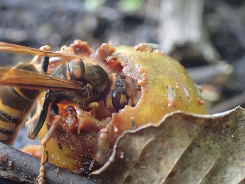 毎日森にいるとスズメバチに会うこともありますが、1匹で飛んでいる時はエサを探していることが多いので襲われることもなく、思いがけず食事風景に出会うこともあります。