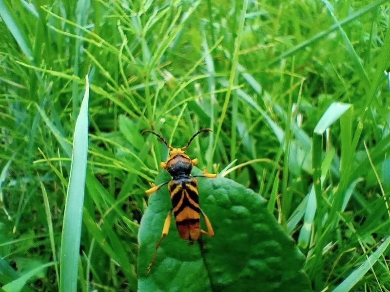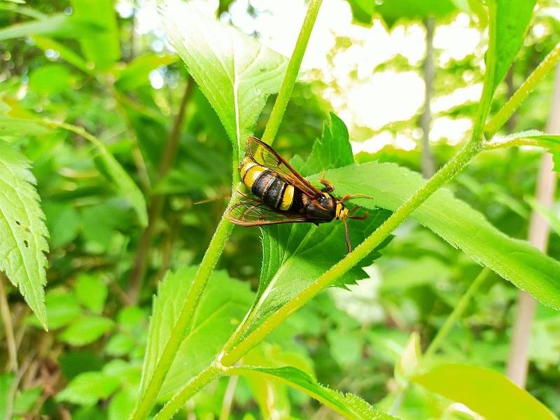 黄色と黒の模様も大きさもオオスズメバチに似ていますが、これはトラフカミキリというカミキリムシの仲間です。スズメバチに似せることで敵から身を守っているようです。