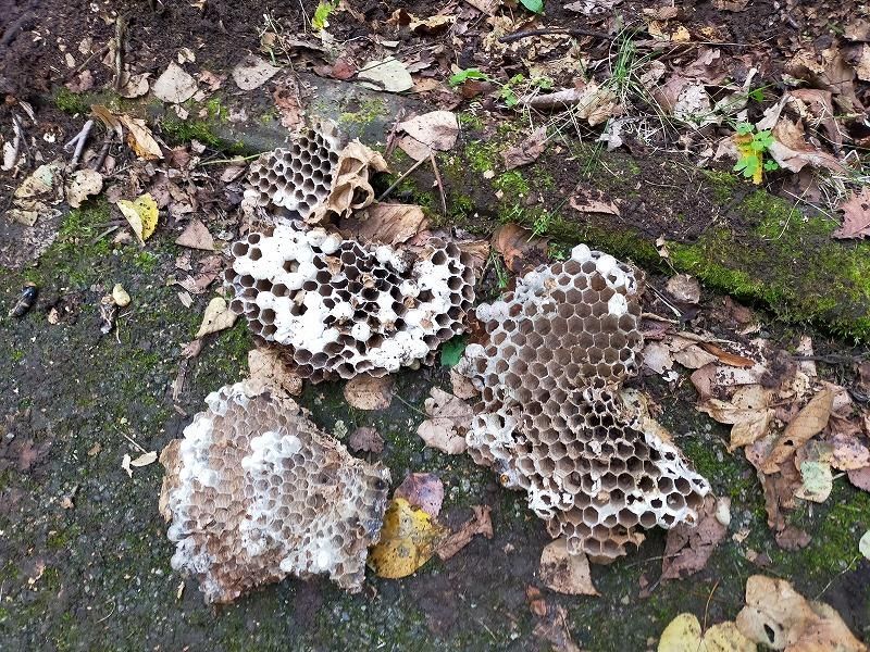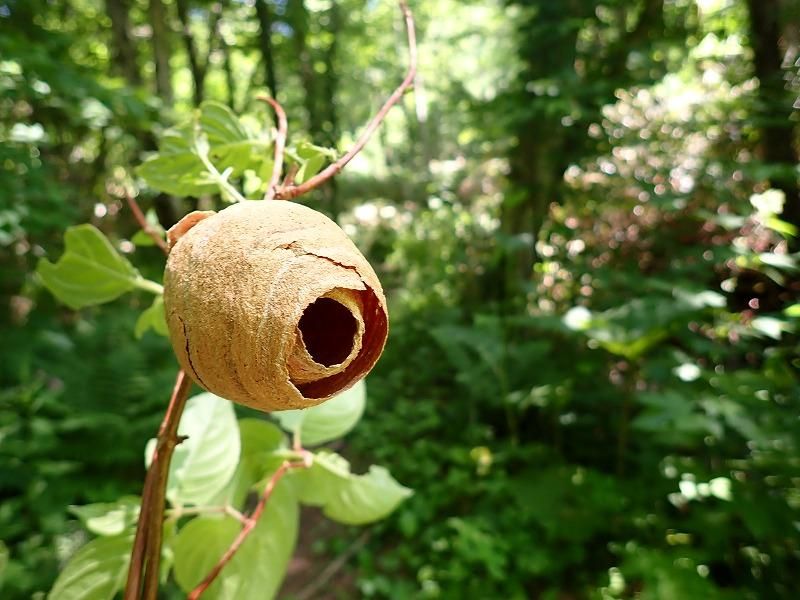スズメバチの巣と言えば丸くて軒下などに作るものを想像しがちですが、一番危険なオオスズメバチや小さくて黒いクロスズメバチは地面に巣を作ることがあります。知らずに草むらに入って巣を踏んだりすると一斉に襲われる可能性があるので、森を歩くときはむやみに散策路を外れないようにしましょう。