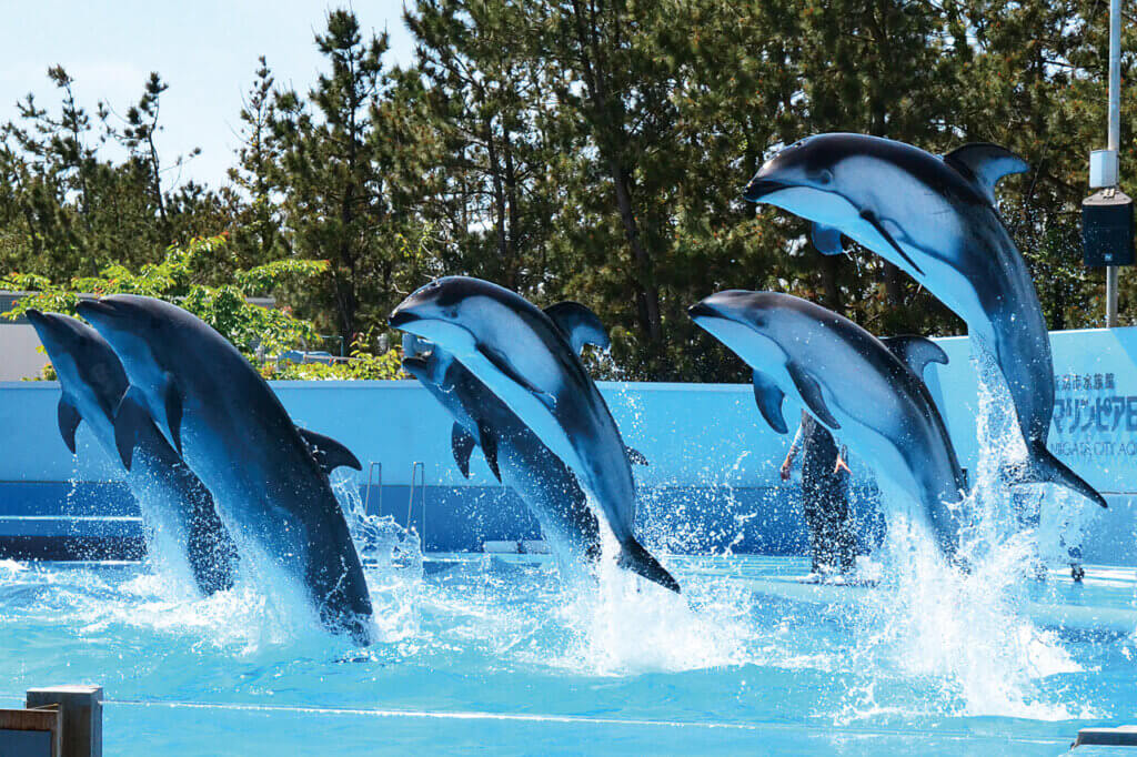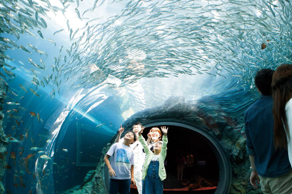 日本海に面した立地を最大限に生かした開放的な水族博物館。大水槽のトンネル「うみがたりチューブ」では、海中気分を味わいながら日本海にすむ魚たちを観察できます。ほか、飼育数日本一のマゼランペンギンや、奥の日本海と一体となったように見える開放感いっぱいの「イルカスタジアム」など、見どころ満載です。