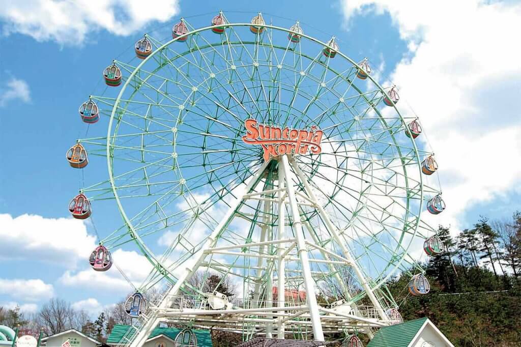 緑の山々や四季の花に囲まれた、「水と緑と太陽のユートピア」がキャッチフレーズの遊園地。ジェットコースターから大観覧車、小さな子ども向けのキッズランドまで、20数種類のアトラクションを楽しめます。