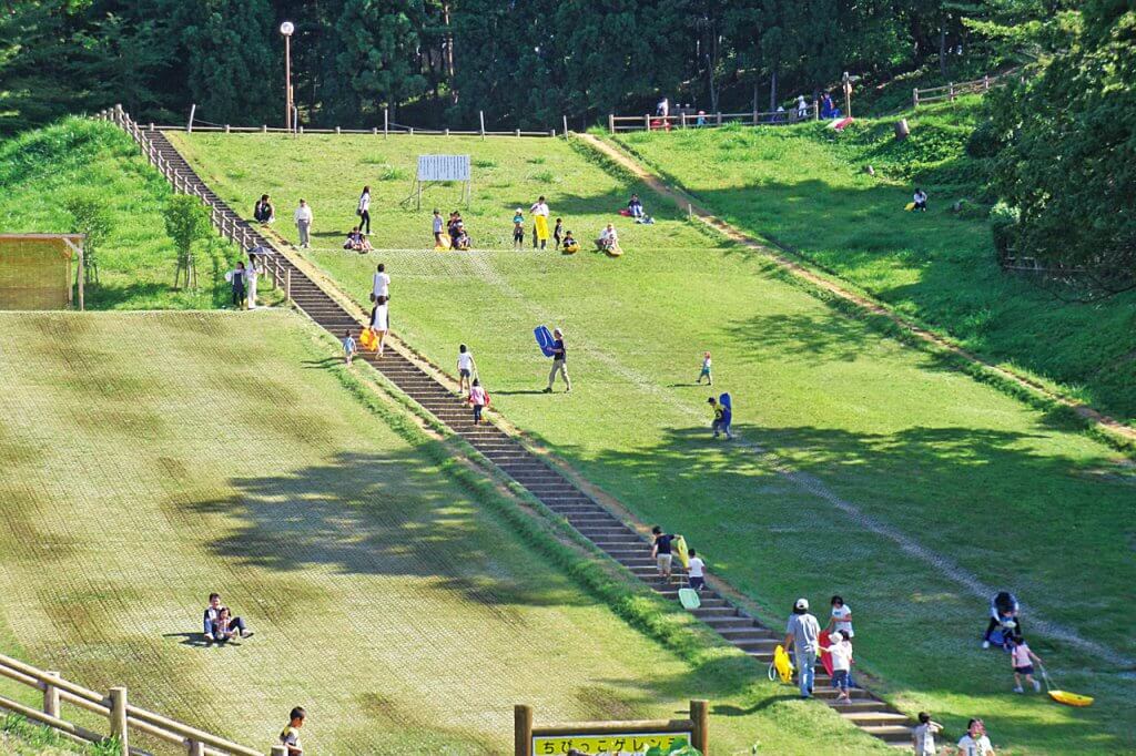 越後平野を見渡せる丘陵地にある公園。人工芝でソリ遊びができるちびっこゲレンデをはじめ、自然の地形を生かしたさまざまなアスレチックや全長60メートルのローラー滑り台、傾斜地の家・びっくりハウスなど、施設が充実しています。思いきり動いたあとは、バーベキューやキャンプも楽しんで。