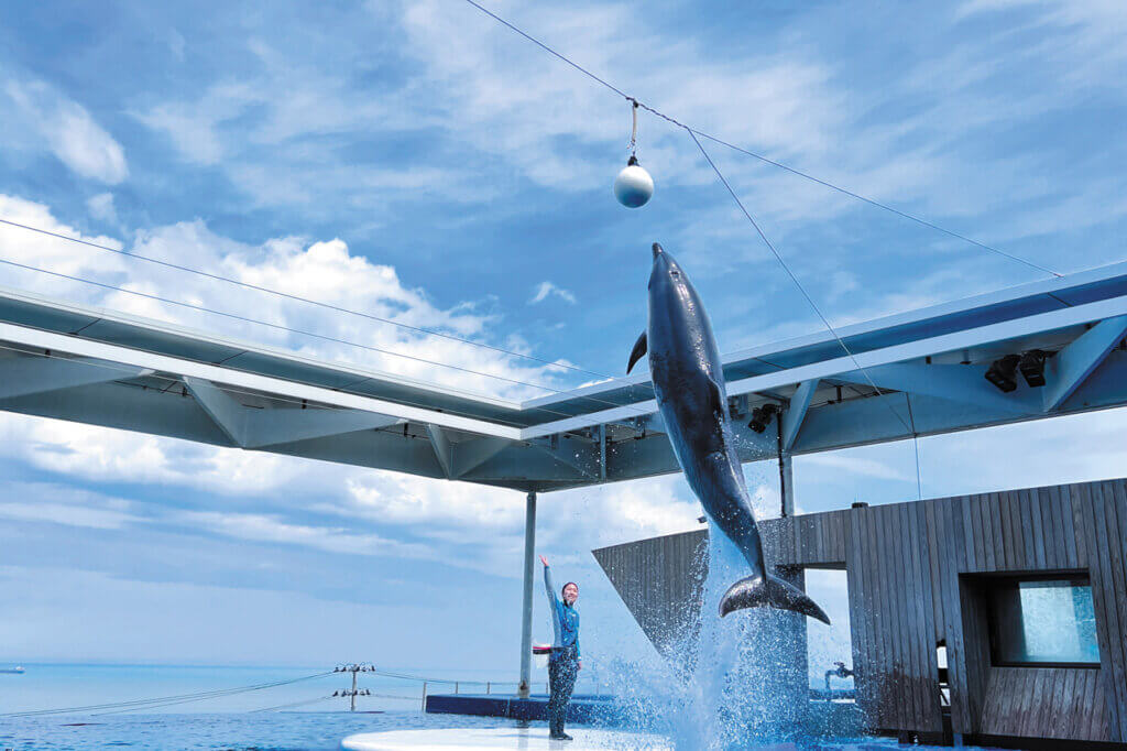 1日に数回開催されるバンドウイルカの力強いパフォーマンスは必見。