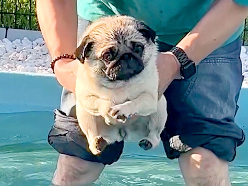 この日、パグの「ぽんず」ちゃんはお友達に誘われて、ドッグランのプールに遊びに来ました。