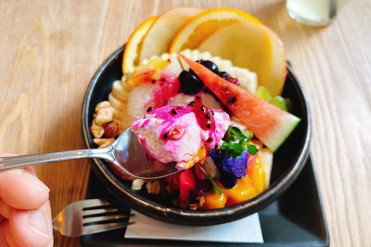 フルーツの下には、ザクザク食感のグラノーラやナッツ、そして毎日手作りされている濃厚なグリークヨーグルトがたっぷりと入っています。 ひと口食べればフルーツのジューシーさとヨーグルトのコクが合わさって食べ応え抜群。朝からおなかがしっかり満たされるのに、後味はさっぱり。ヘルシーで罪悪感ゼロなのがうれしいですね。 「GREEN AND CAFE(グリーンアンドカフェ)」では、その日の仕入れによってフルーツの内容が変わるのもちょっとした楽しみです。アサイーボウルも、もちろんいちから手作りしているそうで、次はぜひアサイーボウルを試してみたい!そんなワクワク感を残してくれる一皿でした。
