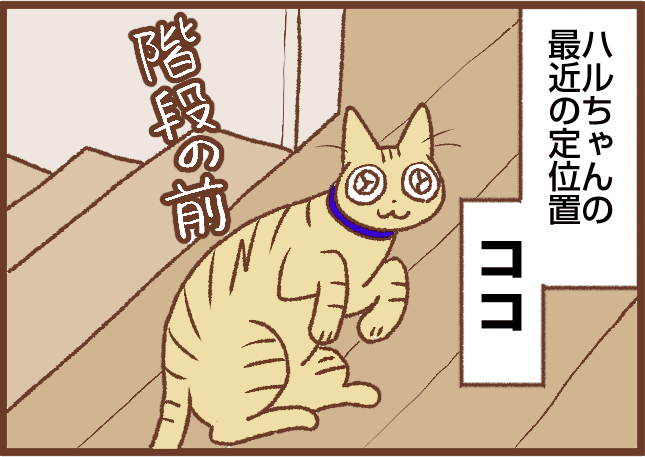 ハルちゃんは、「人が自分の話をしている」という状態がめちゃめちゃに好きなので、こうして階段のところなどにいると話しかけてもらえる!と最近気づいて本当にしょっちゅうここにいます…(笑)