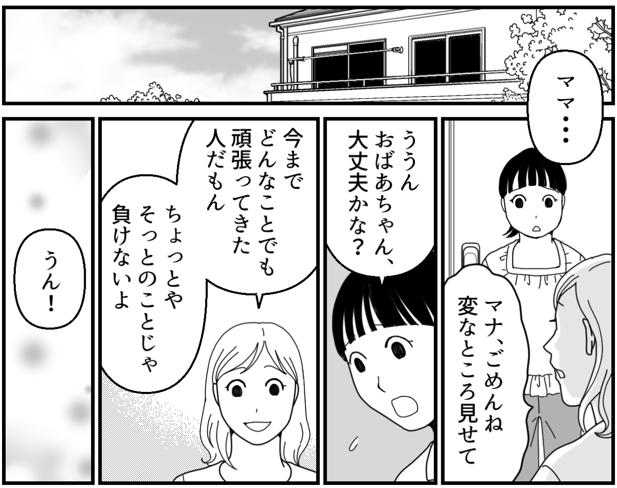 きっと義母は「自分がいなくなったら、夫が追いかけてきて連れ戻そうとするはず」と考えていたのでしょう。だからこそあえて手紙に「探さないで」と記したのかもしれません。 「二度とこの家には戻らない」という義母の強い意志を感じました。 義母がいなくなったことに娘のマナはショックを受けたようで、私に「逃げよう」と提案してきます。 日中は仕事で家にいない私たちよりも、マナの方が義母の様子をよく見ていたのかもしれません。 娘の心を傷つけてまで、ここにいる必要がないことは分かっています。 けれど義母に「任せます」と言われた以上、私は任務を果たさないといけない……そう思うのでした。