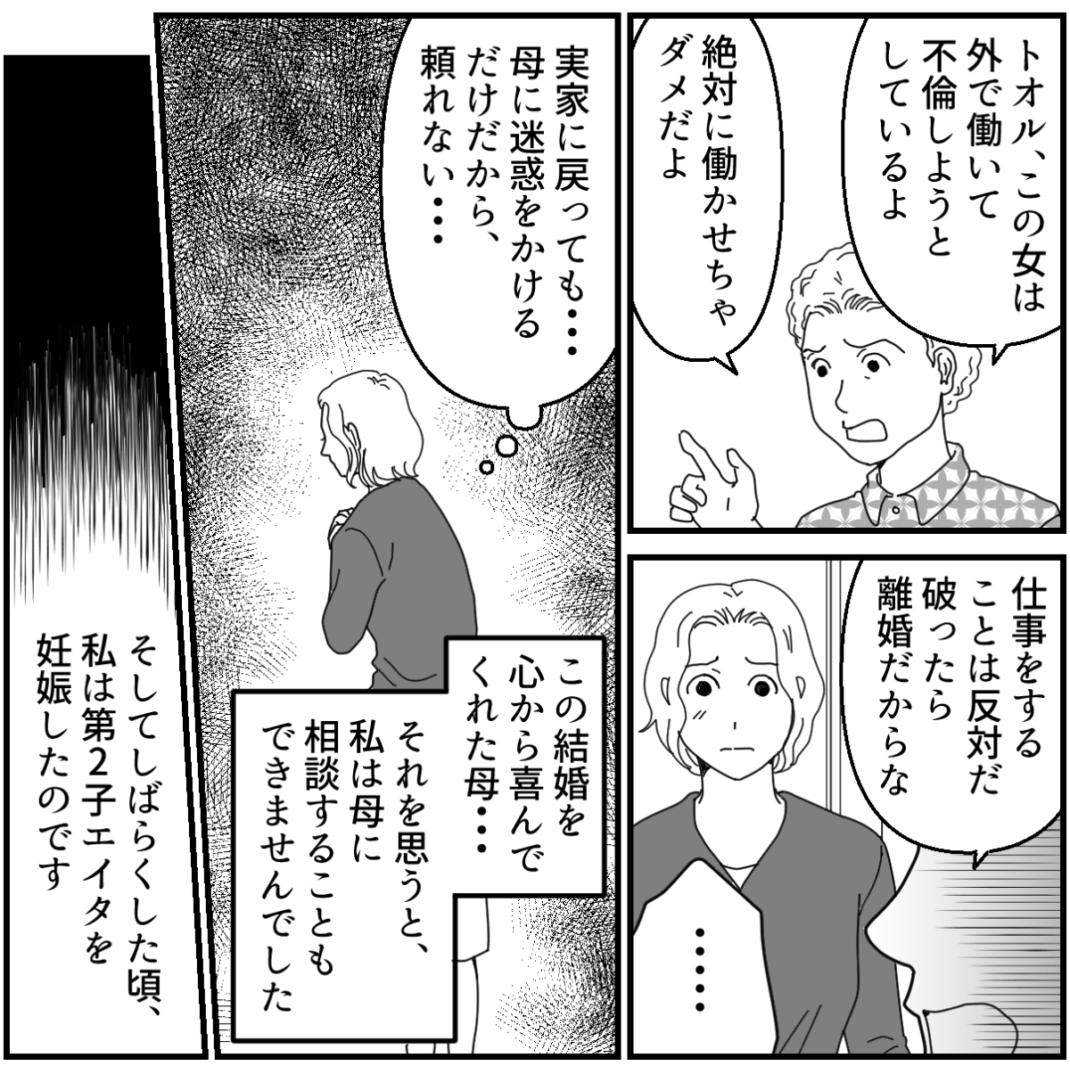 リョウコさんの言葉は、いつも私を安心させてくれました。でも私にはこの家を出ていく勇気がありません。エイタのことや姑のことを言い訳にしているけれど、結局は自分ひとりで出ていくのが怖かったんだと思います。出ていきたいけど出ていけない、それが私の現状でした。 しかしそんななか大事件が起こるのです。なんと夫が不倫をしていたことが発覚。写真や手紙の内容、そして子どもの成長具合を見るかぎり、おそらく10年近く同じ女性と不倫をしているのでしょう。このことを夫に確かめないと……そう思ったのでした。