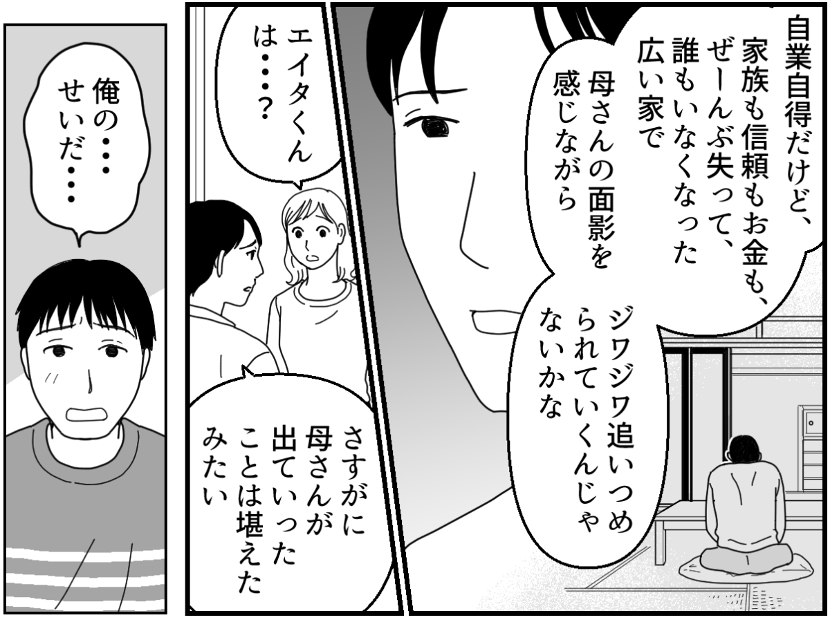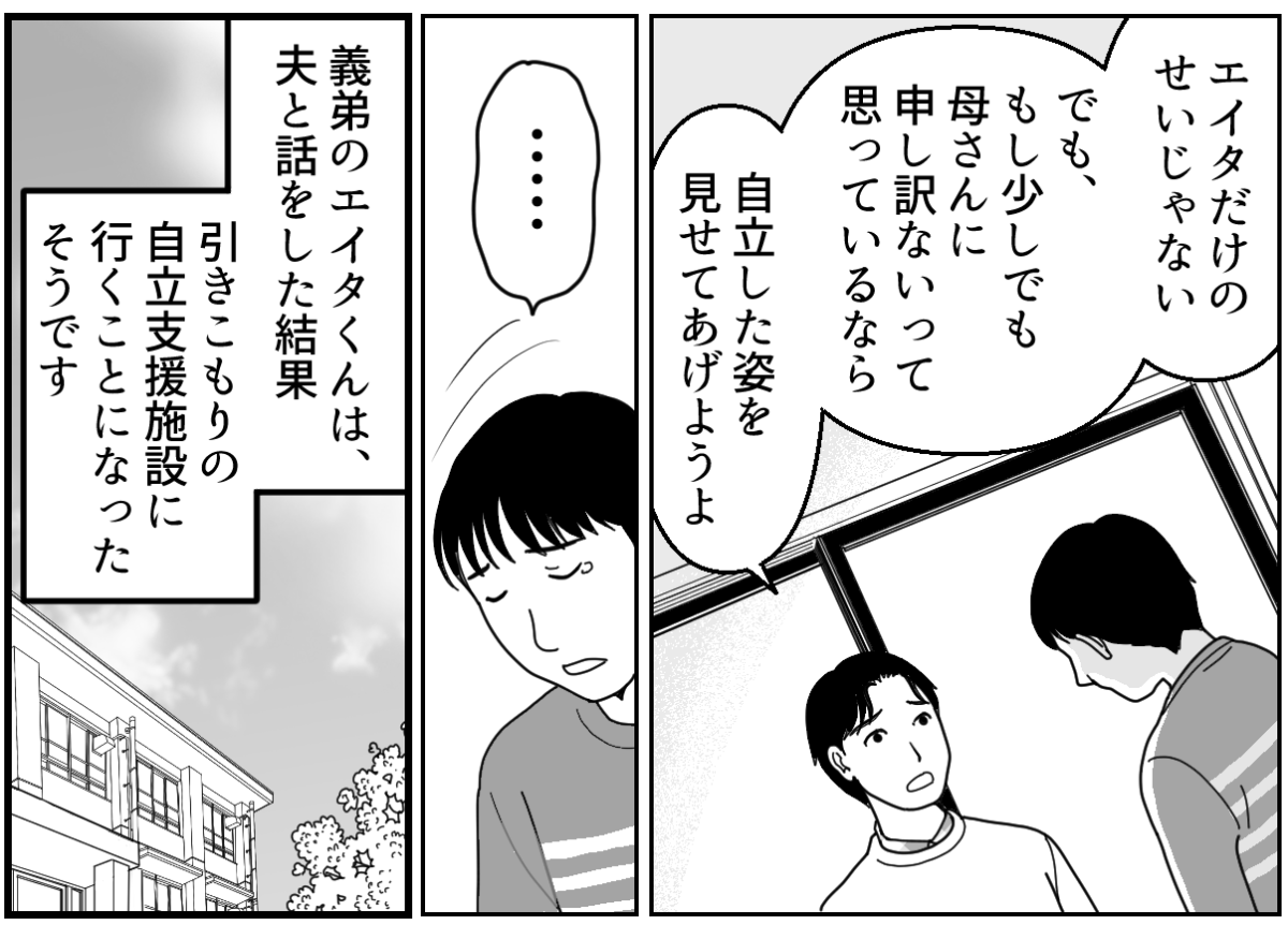 子どもたちを連れて、この家から出ていきたいと何度思ったことでしょう。でも、できなかった。経済力に不安があり、子どもたちに苦労をさせてしまうことが目に見えていたからです。だから夫に分かってもらえなくても、姑に何を言われても、母が亡くなって孤独を感じても、私は必死で耐えてきました。 そして社会人になったレイジは無事に巣立っていき、あとはエイタだけ……。そんなふうに思っていたところに、エイタが不登校になってしまったのです。部屋に引きこもり、頑なに学校に行こうとしないエイタ。夫も姑もすべてを私のせいにして、罵声を浴びせてくるようになったのでした。