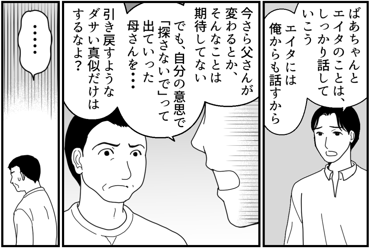 出ていった義母から連絡が入ることはありませんでした。今どこで何をしているのかもわかりません。義母がいなくなった義実家では特に、認知症の義祖母の世話が大変だったようです。夫も駆り出されていましたがなかなか仕事との両立は難しかったようで、とうとう義父から「話がある」と私が呼び出されてしまいます。 義父の話の内容は、おおかた予想がついています。義祖母の介護のことでしょう。 しかし義母が最後の手紙に託した「おばあちゃんとエイタのことは任せます」という言葉は、私に介護をしてくれという話だったのでしょうか? 義母の人柄を考えれば、私はそういう意味ではないだろうと思っています。