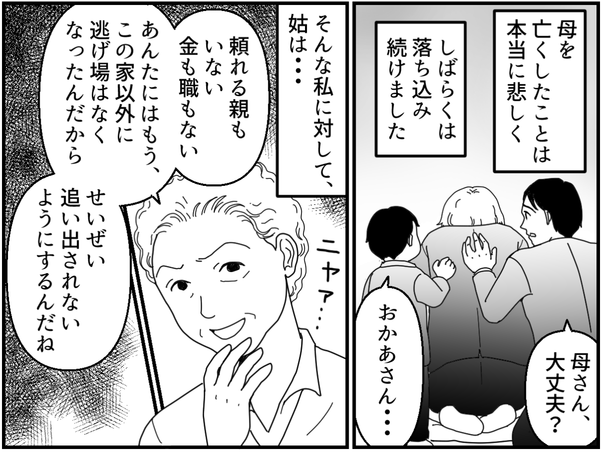レイジが中学生、エイタが5才の頃に、実家の母が亡くなりました。心配をかけたくない一心で、最後まで母に本当のことは言えませんでした。母はきっと、私が幸せだと思って亡くなったに違いありません。しかし悲しみに暮れる私に姑は……。