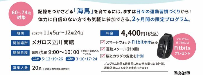 【スマートウォッチプレゼント】シニア世代の脳の健康維持に!11月・12月に実施の「リボーンズ・海馬脳育プログラム」が参加者を市民公募してる。会場は『メガロス立川 南館』