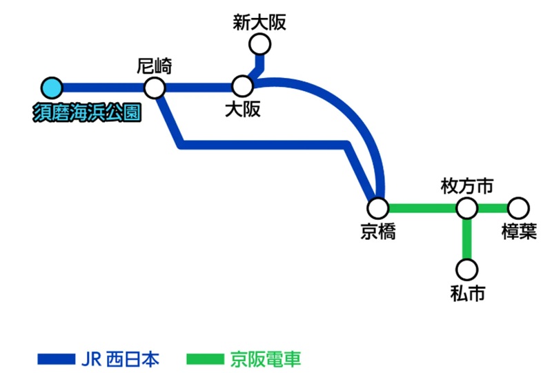 「京阪・JR西日本 神戸須磨シーワールド1dayパス」があれば、京阪電車は京阪本線の京橋駅~樟葉駅、交野線全線、JR西日本は山陽東海道本線の須磨海浜公園駅~新大阪駅、大阪環状線の大阪駅~京橋駅、JR東西線全線が乗り降り自由となります。自由周遊区間内であれば、京阪電車もJR西日本も乗り放題です。