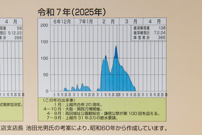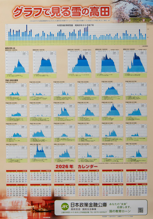 新潟県上越市本町5の日本政策金融公庫高田支店は、同市高田のこれまでの積雪量をまとめたカレンダー「グラフで見る雪の高田」を2025年11月17日から数量限定で無料配布する。毎年数日でなくなる人気ぶりで、同支店は「話の種に使ってもらえたら」と話している。