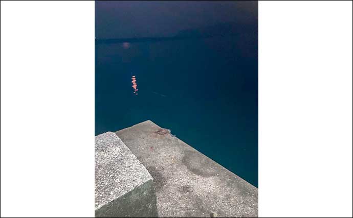 次は漁港奥の漁船が停留している常夜灯絡みのポイント。明かりに集まるアジを狙う。明かりが効いていることもあり、水面には小魚が泳いでいる様子が見える。