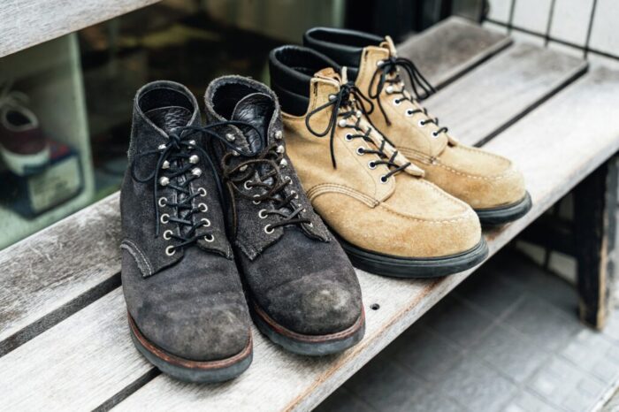 左は日本未発売のモデルで、8821という品番。RED WINGの直営店にて、ブラックソールにカスタマイズしているので、なんとも個性的な仕上がりになっている。右は90年代に人気を博した王道のスーパーソール。ブラックのスムースレザーでなく、スウェードを選択。「最近、RED WINGが自分の中で再燃していて、ブラックソールカスタムを周りに勧めています」