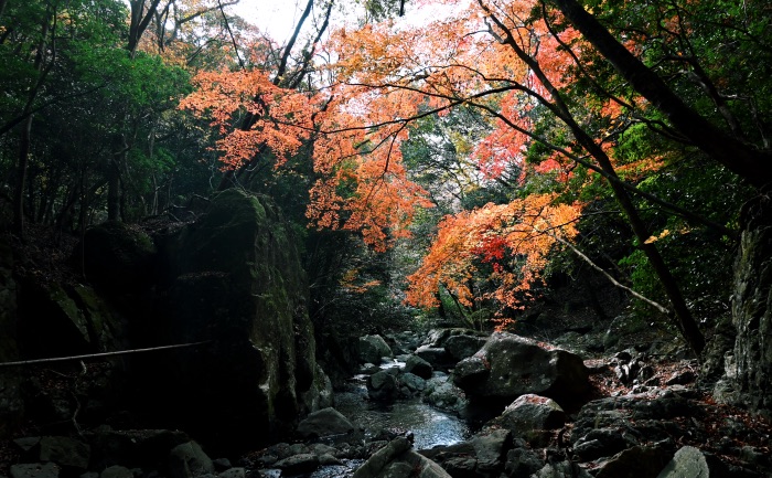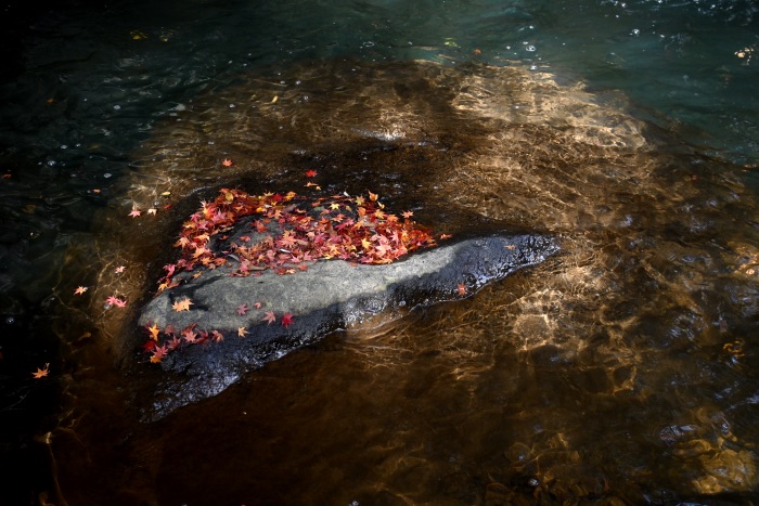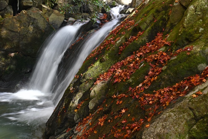 岩肌に散り積もったモミジの葉がはかなく、これからやってくる冬の季節を感じさせました。